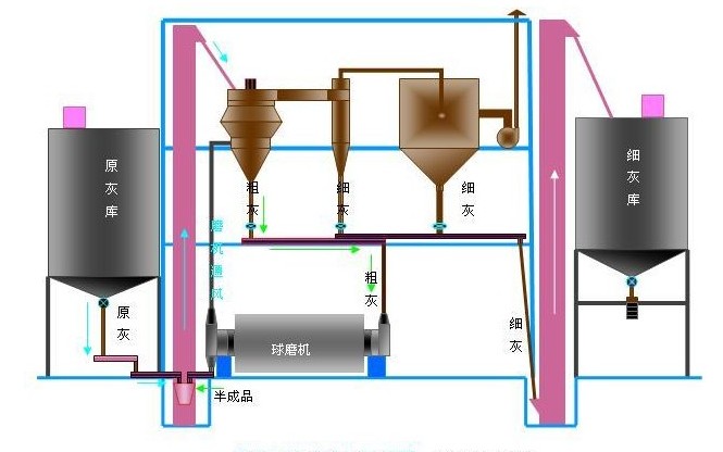 The system is directly from the original ash bin to take the ash, through the spiral feeder, the electronic weighing is transported into the grinding head hoist after the weight of the air slots, and the hoist is fed into the pulverized machine for the grinding. The coarse ash after the separation is sent into the mill inlet through the air inclined trough and enters the grinding mill. The material is contained in the grinding machine after the mill. A large number of fine ash, once again fed by the hoist to the pulverized machine, is sent to the finished ash bank through the subsequent conveying equipment, and the tail of the mill is equipped with a dust collecting system to collect dust. This closed road grinding process can increase the output of 30 to 40% when compared with the open road (no pulverized machine) system. It is the fine and deep processing of the fly ash. Ideal equipment.