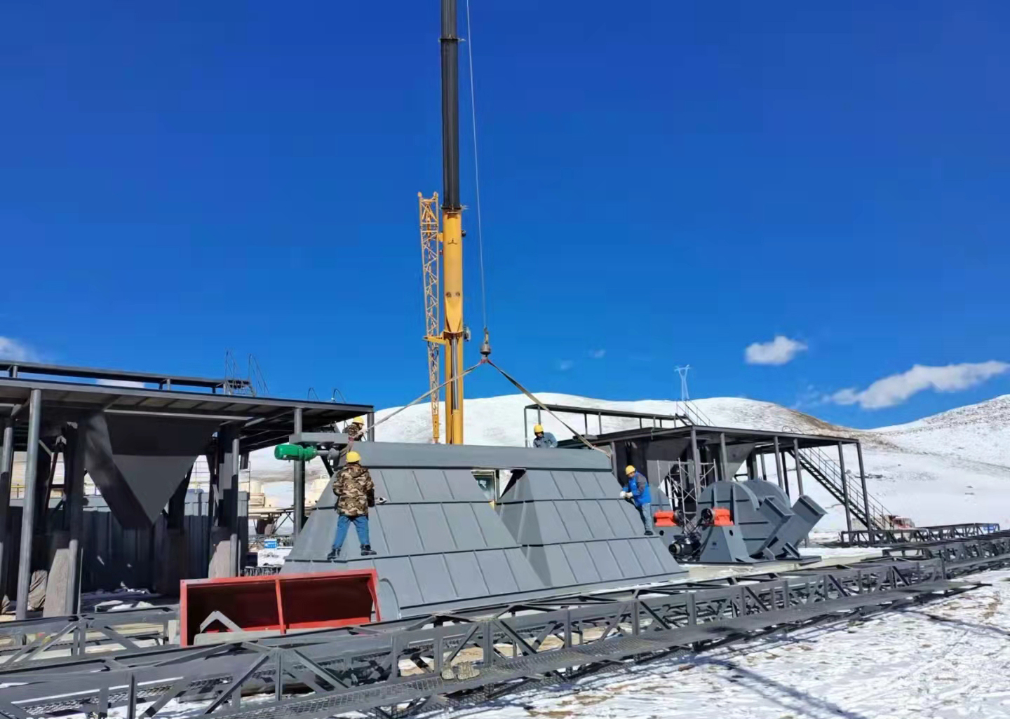 鹽富環(huán)保理塘項(xiàng)目配套的除塵和選粉設(shè)備進(jìn)入安裝調(diào)試階段,為確保川藏鐵路理塘段項(xiàng)目的順利推進(jìn),我司參與此項(xiàng)目的所有成員,在春節(jié)這樣萬家團(tuán)聚的節(jié)日里,都堅(jiān)守在自己的工作崗位上,虎力全開,干勁十足!理塘氣候?qū)俑咴瓪夂騾^(qū),海拔約4300米, 氣溫-30.6℃,冬季干冷而漫長。由于項(xiàng)目地點(diǎn)海拔高,氧氣稀薄,許多人有高原反應(yīng),但他們都努力克服身體上的種種不適,以積極樂觀的心態(tài)面對種種困難,活出了當(dāng)代勞動(dòng)者的風(fēng)采!這幾天,風(fēng)雪交加,氣候寒冷,我們的施工現(xiàn)場仍然是一派熱火朝天!